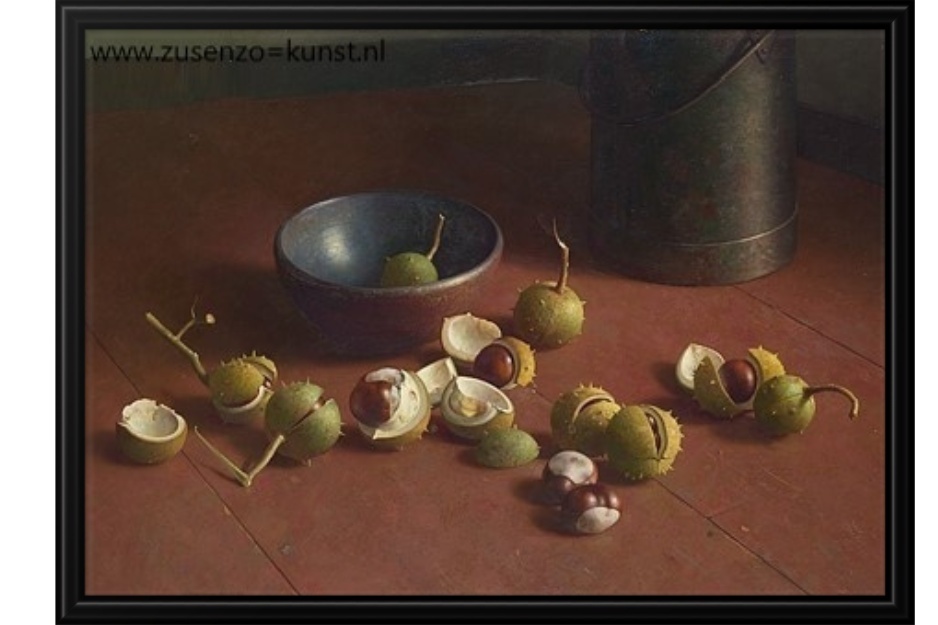 De giclée is haarscherp gedrukt op hoogwaardig doek en vangt elk detail van het origineel: de glans van de kastanjes, de diepte van het hout, het subtiele licht dat de scène tot leven wekt.